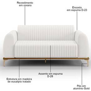 Sofá Molino! A princípio, ele possui base em madeira de eucalipto envernizada com pés em alumínio, estrutura em misto de madeira com MDF e OSB e a parte estofada é em espuma D-23 no encosto e espuma D-28 no assento. Além desses detalhes, também é revestido em tecido PU branco, conferindo requinte e uma dose extra de durabilidade e resistência.