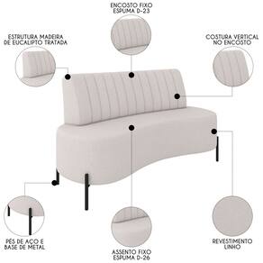 Características do Produto Material da estrutura: Madeira de Eucalipto Tratada. Material do Assento: Espuma D-26. Material do Encosto: Espuma D-23. Revestimento: Linho. Peso Suportado: 150 kg. Quantidade de Assento: Assento Único. Quantidade de Lugares: 2 Lugares. Tipo de Encosto: Fixo. Tipo de Assento: Fixo. Tipo de Pés: Base de Metal. Material dos Pés: Aço. É retrátil: Não. É reclinável: Não. Diferenciais: - Design moderno. - Costura do encosto com detalhes verticais. - Pode ser aproveitado em diversos ambientes, sala de estar, recepção, escritório. Sistema de Montagem: O produto é enviado montado, sendo necessário apenas a fixação dos pés. Manual de Montagem: Não. Volumes: 1 Volume. Conteúdo da Embalagem: 1 Sofá Living. Garantia do Fabricante: 90 dias contra defeito de fabricação. Montagem: Recomendamos que seja feita por um profissional. Recomendação de Limpeza: Utilize pano levemente úmido.