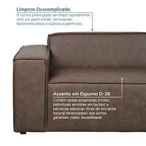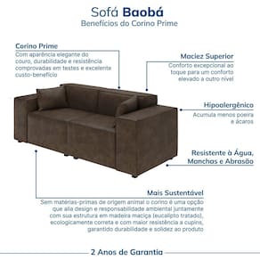 Com presença imponente e traços contemporâneos, o sofá Baobá é a peça ideal para quem valoriza sofisticação e bem-estar no dia a dia. Produto Montado: Sim Acompanha Almofadas extras: 02 Almofada do assento: Fixa Almofada do encosto: Fixa Altura do assento até o chão: 45.0000 Altura do Braço: 63 cm Altura do Encosto: 33,5 cm Altura dos Pés: 3 cm Altura Máxima dos Pés: 3.0000 Ambiente Principal: Sala de Estar codigo_ean: 7900288101020 Complexidade da Montagem: Baixa: pode ser montado por uma pessoa sozinha Cor: Castanho Cor do Produto: Castanho Densidade do Assento: D-26 Densidade do Encosto: D-20 Enchimento do Assento: Espuma Enchimento do Encosto: Espuma Estilo de Braço: Braços Quadrados Firmeza do Assento: Médio Itens Inclusos: 1 sofá e manual de montagem Largura do Braço: 30 cm Linha ou Coleção: Baobá Manual de Montagem e Instalação: https://product-hub-prd.madeiramadeira.com.br/983245/documents/33b9f33c-3435-480d-9558-34303a22171a2767750469117430199882551.pdf Marca: CabeCasa MadeiraMadeira Material dos Pés: Madeira Necessita Montagem: Sim Origem do Produto: Nacional Peso: 68 kg Pet Friendly: Não Possui Mola: Sim Possui Percintas Elásticas: Sim Possui Pés: 08 Possui Rodízio: Não Recomendações de Uso, Manutenção e Limpeza: Utilize um pano levemente umedecido, seguido de pano seco. Não utilizar escovas, produtos químicos ou abrasivos e não deixar exposto a luz solar. Revestimento do Braço: Sintético Sistema de Montagem: Parafusos Suporta Até (kg): 120 kg Tecido Predominante: Sintético Tipo de Encosto: Fixo Tipo de Mola: Molas Ensacadas (Molas ensacadas) Tipo de Sofá: Sofá Comum
