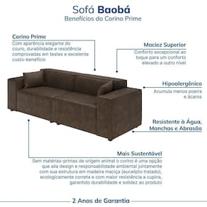 Com presença imponente e traços contemporâneos, o sofá Baobá é a peça ideal para quem valoriza sofisticação e bem-estar no dia a dia. Produto Montado: Sim Acompanha Almofadas extras: 02 Almofada do assento: Fixa Almofada do encosto: Fixa Altura do assento até o chão: 45.0000 Altura do Braço: 63 cm Altura do Encosto: 33,5 cm Altura dos Pés: 3 cm Altura Máxima dos Pés: 3.0000 Ambiente Principal: Sala de Estar codigo_ean: 7900288101044 Complexidade da Montagem: Baixa: pode ser montado por uma pessoa sozinha Cor: Castanho Cor do Produto: Castanho Densidade do Assento: D-26 Densidade do Encosto: D-20 Enchimento do Assento: Espuma Enchimento do Encosto: Espuma Estilo de Braço: Braços Quadrados Firmeza do Assento: Médio Itens Inclusos: 1 sofá e manual de montagem Largura do Braço: 30 cm Linha ou Coleção: Baobá Manual de Montagem e Instalação: https://product-hub-prd.madeiramadeira.com.br/983248/documents/439146e6-30ee-4e48-bbd8-4c4788b2c9cc276777746911743020177054.pdf Marca: CabeCasa MadeiraMadeira Material dos Pés: Madeira Necessita Montagem: Sim Origem do Produto: Nacional Peso: 86 kg Pet Friendly: Não Possui Mola: Sim Possui Percintas Elásticas: Sim Possui Pés: 08 Possui Rodízio: Não Recomendações de Uso, Manutenção e Limpeza: Utilize um pano levemente umedecido, seguido de pano seco. Não utilizar escovas, produtos químicos ou abrasivos e não deixar exposto a luz solar. Revestimento do Braço: Sintético Sistema de Montagem: Parafusos Suporta Até (kg): 120 kg Tecido Predominante: Sintético Tipo de Encosto: Fixo Tipo de Mola: Molas Ensacadas (Molas ensacadas) Tipo de Sofá: Sofá Comum