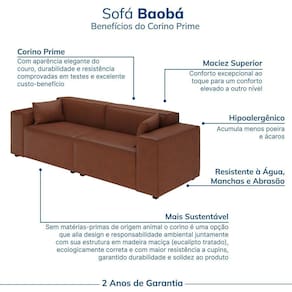 Com presença imponente e traços contemporâneos, o sofá Baobá é a peça ideal para quem valoriza sofisticação e bem-estar no dia a dia. Produto Montado: Sim Acompanha Almofadas extras: 02 Almofada do assento: Fixa Almofada do encosto: Fixa Altura do assento até o chão: 45.0000 Altura do Braço: 63 cm Altura do Encosto: 33,5 cm Altura dos Pés: 3 cm Altura Máxima dos Pés: 3.0000 Ambiente Principal: Sala de Estar codigo_ean: 7900288101051 Complexidade da Montagem: Baixa: pode ser montado por uma pessoa sozinha Cor: Coffee Cor do Produto: Coffee Densidade do Assento: D-26 Densidade do Encosto: D-20 Enchimento do Assento: Espuma Enchimento do Encosto: Espuma Estilo de Braço: Braços Quadrados Firmeza do Assento: Médio Itens Inclusos: 1 sofá e manual de montagem Largura do Braço: 30 cm Linha ou Coleção: Baobá Manual de Montagem e Instalação: https://product-hub-prd.madeiramadeira.com.br/983249/documents/7729d429-7503-4e10-b590-504f80fd1fa82767788469117430202781745.pdf Marca: CabeCasa MadeiraMadeira Material dos Pés: Madeira Necessita Montagem: Sim Origem do Produto: Nacional Peso: 86 kg Pet Friendly: Não Possui Mola: Sim Possui Percintas Elásticas: Sim Possui Pés: 08 Possui Rodízio: Não Recomendações de Uso, Manutenção e Limpeza: Utilize um pano levemente umedecido, seguido de pano seco. Não utilizar escovas, produtos químicos ou abrasivos e não deixar exposto a luz solar. Revestimento do Braço: Sintético Sistema de Montagem: Parafusos Suporta Até (kg): 120 kg Tecido Predominante: Sintético Tipo de Encosto: Fixo Tipo de Mola: Molas Ensacadas (Molas ensacadas) Tipo de Sofá: Sofá Comum