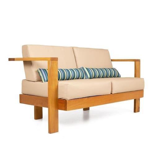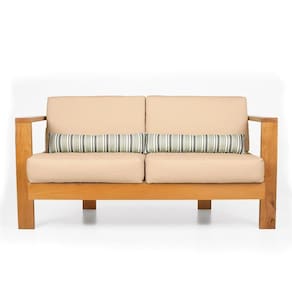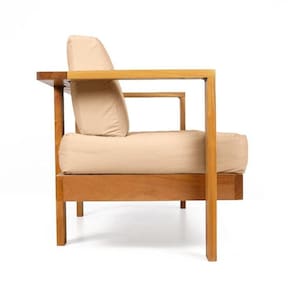 Fabricado em tecido de alta qualidade em Sarja Impermeável, seu enchimento é composto por manta fibra siliconada, estruturado por espuma ortopédica D33 para o assento e D23 para o encosto. A estrutura é produzida em madeira nobre de grápia com pintura na cor natural.