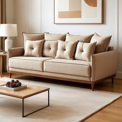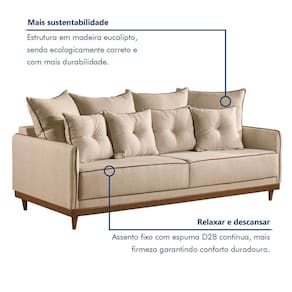 Sim, a estrutura reforçada oferece ótima estabilidade e durabilidade no uso diário. Produto Montado: Sim Acompanha Almofadas extras: Sim Almofada do assento: Fixa Almofada do encosto: Removível Altura do assento até o chão: 42.0000 Altura do Encosto: 44 cm Ambiente Principal: Sala de Estar codigo_ean: 7900288292896 Complexidade da Montagem: Baixa: pode ser montado por uma pessoa sozinha Consistência do Assento: Médio Cor: Bege Cor do Produto: Bege Densidade do Assento: D-28 Enchimento do Assento: Espuma Firmeza do Assento: Médio Itens Inclusos: 1 Sofá e 4 Almofadas Linha ou Coleção: Athena Marca: NOBLY DECOR LTDA Material dos Pés: Madeira Maciça Necessita Montagem: Sim Peso: 66.0000 Pet Friendly: Não Possui Mola: Sim Possui Percintas Elásticas: Sim Possui Pés: 04 Possui Rodízio: Não Recomendações de Uso, Manutenção e Limpeza: Não use produtos químicos, eles podem danificar o revestimento Sistema de Montagem: Enroscar Suporta Até (kg): 120 kg Tecido Predominante: Linho Tipo de Encosto: Fixo Tipo de Mola: Molas Bonnel Tipo de Sofá: Sofá Comum Marca: Não Informado