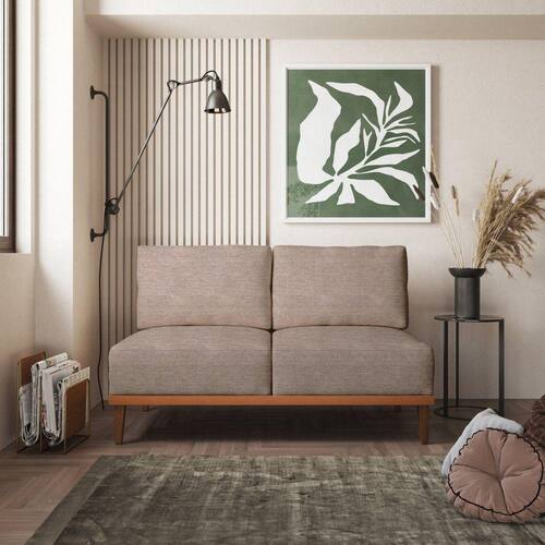 Estofado Boreal possui detalhes na costura do encosto e assento. Base em Madeira Ecupalípto revestido em PU na cor marrom, pés em madeira imbirema, na cor marrom.