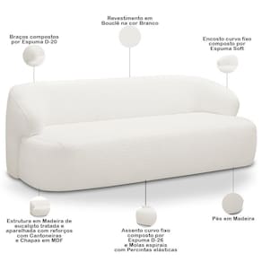 Altura: 78 cm | Color: Branco | ColorFamily: Branco | ColorSimple: Branco | ColorSupplier: Branco | Cor: Branco | Cor dos pés: -1 | Densidade da espuma do assento: D-26 | Desenho do tecido: Liso | Estilo: Moderno | Fabricante: Lyam Decor | Formato do sofá: Linear | Largura: 150 cm | Linha: Sala de Estar | Material: Estrutura em madeira de eucalipto tratada e aparelhada com reforços, cantoneiras e chapas em MDF. | Material de enchimento do encosto: Encosto curvo fixo composto por espuma soft. | Material do estofamento: Bouclê | MaterialFamily: Madeira ,Tecido | Mecanismo de abertura do produto: -1 | Model: Barolo | Orientação do Sofá: -1 | OriginCountry: | OriginState: PR | Peso: 50 kg | Peso máximo suportado: 120 kg | ProductContents: 01 Sofá | ProductHeight: 78 cm | ProductInstructions: Produto para uso em ambiente interno, nao devendo ficar exposto ao sol, calor e umidade excessivos. | ProductLength: 90 cm | ProductWarranty: 90 dias após o do produto | ProductWeight: 50 kg | ProductWidth: 150 cm | Profundidade: 90 cm | Quantidade de Caixas de embalagem: 1 | Requer montagem: Não | SizeDescription: Altura: 78 cm x Largura: 150 cm x Profundidade: 90 cm | SupplierSimpleName: Sofá 2 Lugares Curvo Orgânico Para Sala Living 150cm Barolo L06 Bouclê Branco - Lyam Decor | Tipo de produto: Sofá | Unidades por kit: 1