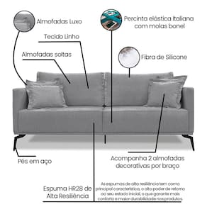 O Sofá 2 Lugares Rafaela é uma mobília que combina elegância, conforto e durabilidade. Ele tem um design moderno e sofisticado, com pés em aço carbono, e revestimento em tecido Linho Cinza, que harmonizam com qualquer ambiente. Ele é ideal para sala de estar, recepções ou qualquer outro espaço que você queira decorar com estilo e bom gosto. Ele tem uma estrutura em madeira de reflorestamento eucalipto, que garante a resistência e a sustentabilidade do produto. Com medidas de 180 cm ele suporta até 140 Kg de peso, podendo ser utilizado por pessoas de diferentes biotipos. Ele tem um acabamento reforçado com espuma de qualidade no encosto D23 e plumante em silicone, que oferece maciez e aconchego. Acompanha Almofadas soltas em fibra de silicone. Ele tem assento Fixo com inúmeras elásticas italiana, molas bonnel e espuma HR 28 e plumante em silicone, que proporcionam flexibilidade e conforto. Tem pés em aço carbono, alt.18 cm, cor preto, que protegem o produto contra corrosão e desgaste. O sofá Rafaela é um produto de alta qualidade, beleza e funcionalidade. Ele é fácil de transportar, pois tem um peso leve e um tamanho compacto. O sofá Rafaela é um produto que vai fazer a diferença na sua decoração e no seu bem-estar. Ela vai trazer charme, conforto e durabilidade para o seu ambiente. Aproveite essa oferta e leve para casa um sofá de qualidade por um preço incrível. Essa é a sua chance de ter um sofá maravilhoso por um preço imperdível. Corra e garanta o seu antes que acabe o estoque.
