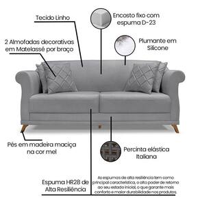 O Sofá 2 Lugares Julieta é uma mobília que combina elegância, conforto e durabilidade. Ele tem um design moderno e sofisticado, com pés em madeira maciça na cor mel e revestimento em tecido Linho Cinza, que harmonizam com qualquer ambiente. Ele é ideal para sala de estar, recepções ou qualquer outro espaço que você queira decorar com estilo e bom gosto. Ele tem uma estrutura em madeira de reflorestamento eucalipto, que garante a resistência e a sustentabilidade do produto. Com medidas de 180 cm ele suporta Até 140 Kg de peso, podendo ser utilizado por pessoas de diferentes biotipos. Ele tem um acabamento reforçado com espuma de qualidade no encosto D23 e plumante em silicone, que oferece maciez e aconchego. Acompanha 2 almofadas decorativas ( Enchimento fibra de silicone) bordadas em matelassê por braço. Ele tem assento Fixo com percintas elásticas italiana, espuma HR 28 e plumante em silicone, que proporcionam flexibilidade e conforto. Tem pés em madeira maciça com altura de 12 cm, que protegem o produto contra corrosão e desgaste. O sofá Julieta é um produto de alta qualidade, beleza e funcionalidade. Ele é fácil de transportar, pois tem um peso leve e um tamanho compacto. O sofá Julieta é um produto que vai fazer a diferença na sua decoração e no seu bem-estar. Ela vai trazer charme, conforto e durabilidade para o seu ambiente. Aproveite essa oferta e leve para casa um sofá de qualidade por um preço incrível. Essa é a sua chance de ter um sofá maravilhoso por um preço imperdível. Corra e garanta o seu antes que acabe o estoque!