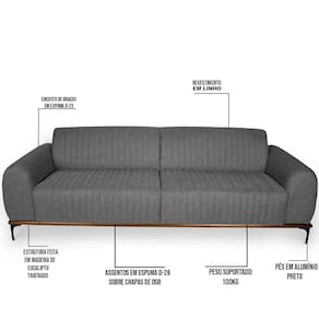 Altura: 76 cm | AssemblyRequired: Sim, sugerimos a contratação do nosso serviço de montagem (para os CEPs em que o serviço está dispon | Color: Cinza | ColorFamily: Cinza | ColorSimple: Cinza | ColorSupplier: Cinza | Cor: Cinza | Gênero: Unisex | Largura: 230 cm | Manual: Sim | Marca: Domi | Material: Madeira Eucalipto | MaterialFamily: Madeira Eucalipto | Model: Molino | Origem: Nacional | OriginCountry: Nacional | OriginState: PR | Peso: 45 kg | Peso Suportado: 120 kg | ProductContents: 1 Sofá | ProductHeight: 76 | ProductInstructions: Produto para uso em ambiente interno, nao devendo ficar exposto ao sol, calor e umidade excessivos. | ProductLength: 89 | ProductWarranty: 90 dias após o recebimento do produto | ProductWeight: 45 | ProductWidth: 230 | Profundidade: 85 cm | Requere montagem: Sim | SizeDescription: 76 x 230 x 89 cm | SupplierSimpleName: Sofá 230cm 3 Lugares Pés Preto Molino C-416 Linho Cinza - Domi | Tipo de : Fabricante