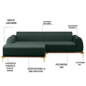 Altura: 76 cm | AssemblyRequired: Sim, sugerimos a contratação do nosso serviço de montagem (para os CEPs em que o serviço está dispon | Color: Verde | ColorFamily: Verde | ColorSimple: Verde | ColorSupplier: Verde | Cor: Verde | Gênero: Unisex | Largura: 230 cm | Manual: Sim | Marca: Domi | Material: Madeira Eucalipto | MaterialFamily: Madeira Eucalipto | Model: Molino | Origem: | OriginCountry: | OriginState: PR | Peso: 78 kg | Peso Suportado: 120 kg | ProductContents: 1 Sofá | ProductHeight: 76 | ProductInstructions: Produto para uso em ambiente interno, nao devendo ficar exposto ao sol, calor e umidade excessivos. | ProductLength: 85 | ProductWarranty: 90 dias após o do produto | ProductWeight: 78 | ProductWidth: 230 | Profundidade: 85 cm | Requere montagem: Sim | SizeDescription: 76 x 230 x 85 cm | SupplierSimpleName: Sofá 230cm 4 Lugares com Chaise Esquerdo Pés Gold Molino C-117 Linho Verde - Domi | Tipo de : Fabricante