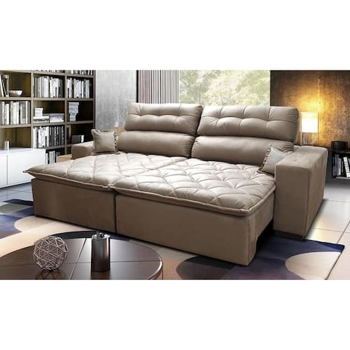 Sofá 2,42m Retrátil E Reclinável Com Molas Cama Inbox Confort Tecido Suede Velusoft Castor Um modelo exclusivo e muito confortável, o Sofá Cama inBox Confort une tudo que há de melhor em um sofá: beleza, qualidade e conforto. Feito com materiais de primeira linha, seus assentos são feitos com espuma D33, manta grossa de fibra siliconada, molas espirais, bordados pantográficos e muito mais. Modelo perfeito para deixar a sua casa completa e garantir um ambiente muito mais aconchegante e sofisticado, esse sofá faz parte da linha especial de estofados da Cama inBox, trazendo uma maravilhosa experiencia de conforto, beleza e descanso. Características: -Encosto Reclinável com 5 posições, almofadas fixas compostas de 80% fibra siliconada e 20% flocos de espuma e percintas elasticas para maior conforto. -Assentos: Retráteis com espuma D33 envolvidas em manta grossa de fibra SILICONADA compactada, Molas espiral, percintas Pneumáticas com feltro para proteger do atrito com as molas. -Braços: Com 25cm de largura. -Fixação: Grampos galvanizados. -Estrutura de Madeira maciça 100% eucalipto de reflorestamento, produto ecologicamente correto. -Tecido suede com toque aveludado.