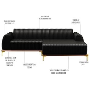 Altura: 76 cm | AssemblyRequired: Sim, sugerimos a contratação do nosso serviço de montagem (para os CEPs em que o serviço está dispon | Color: Preto | ColorFamily: Preto | ColorSimple: Preto | ColorSupplier: Preto | Cor: Preto | Gênero: Unisex | Largura: 245 cm | Manual: Sim | Marca: Domi | Material: Madeira Reflorestada | MaterialFamily: Madeira Reflorestada | Model: Molino | Origem: | OriginCountry: | OriginState: PR | Peso: 83 kg | Peso Suportado: 120 kg | ProductContents: 1 Sofá | ProductHeight: 76 | ProductInstructions: Produto para uso em ambiente interno, nao devendo ficar exposto ao sol, calor e umidade excessivos. | ProductLength: 85 | ProductWarranty: 90 dias após o do produto | ProductWeight: 83 | ProductWidth: 245 | Profundidade: 85 cm | Requere montagem: Sim | SizeDescription: 76 x 245 x 85 cm | SupplierSimpleName: Sofá 245cm 4 Lugares com Chaise Direito Pés Gold Molino B-159 Corano Preto - Domi | Tipo de : Fabricante