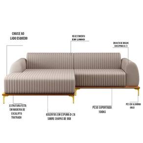 Altura: 76 cm | AssemblyRequired: Sim, sugerimos a contratação do nosso serviço de montagem (para os CEPs em que o serviço está dispon | Color: Bege | ColorFamily: Bege | ColorSimple: Bege | ColorSupplier: Bege | Cor: Bege | Gênero: Unisex | Largura: 245 cm | Manual: Sim | Marca: Domi | Material: Madeira Reflorestada | MaterialFamily: Madeira Reflorestada | Model: Molino | Origem: | OriginCountry: | OriginState: PR | Peso: 83 kg | Peso Suportado: 120 kg | ProductContents: 1 Sofá | ProductHeight: 76 | ProductInstructions: Produto para uso em ambiente interno, nao devendo ficar exposto ao sol, calor e umidade excessivos. | ProductLength: 85 | ProductWarranty: 90 dias após o do produto | ProductWeight: 83 | ProductWidth: 245 | Profundidade: 85 cm | Requere montagem: Sim | SizeDescription: 76 x 245 x 85 cm | SupplierSimpleName: Sofá 245cm 4 Lugares com Chaise Esquerdo Pés Gold Molino C-107 Linho Bege - Domi | Tipo de : Fabricante