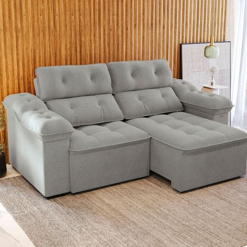 Para conforto e beleza em todos os momentos, aposte no Sofá Sierra 2,6m da Kappesberg. Robusto e confortável, ele é produzido em estrutura resistente, e seus diferenciais ficam por conta do sitema de rodízios e trilho de madeira, facilitando o manuseio. Além disso, com molas ensacadas, ele é retrátil e articulável em seis posições, proporcionando o ajuste conforme a sua preferência. Com espumas certificadas, os assentos, encostos e apoios de braço contam com enchimento em fibras e flocos de espumas, garantindo muito conforto. Medindo 1,33m de altura, 2,6m de largura e 1,32m de profundidade, o sofá é revestido em tecido Bouclé Cinza, garantindo um toque suave e gostoso, suportando até 120kg por assento. Os destaques ficam para para os puxes, que garantem beleza e um acabamento único.