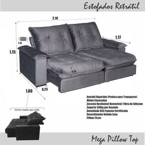 Medidas:Altura 1,15m / Comprimento 2,10m / Profundidade Fechado 1,17m / Profundidade Aberto 1,80m