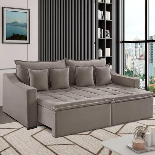 Presente nos lares dos consumidores mais exigentes, a ESTOFART mantém uma trajetória de sucesso desde 1991, investindo sempre na qualidade, em novas tecnologias e no design contemporâneo. Dentro da nova coleção 2023 está o Estofado AMY, feito com madeira de reflorestamento e revestido com Veludo 100% poliéster. No assento, além do Pillow Top com espuma D28 Supersoft, possui também molas de aço que auxiliam na sustentação, aumentando o conforto e a durabilidade do produto; o encosto possui enchimento de fibra de silicone. Possui ainda rodinhas de silicone e pés de madeira maciça envernizados. O design diferenciado e a atenção aos acabamentos e detalhes durante todas as etapas de produção, fazem do Estofado AMY sinônimo de versatilidade e conforto para a sua casa. Acompanha Almofadas extras: 04 Almofada do assento: Fixa Almofada do encosto: Fixa Altura do assento até o chão: 50 Altura do Encosto: 47 Ambiente Principal: Sala de Estar Complexidade da Montagem: Baixa: pode ser montado por uma pessoa sozinha Cor: Bege Marroml Cor do Produto: Bege Marroml Densidade do Assento: D-28 Densidade do Encosto: Camadas de Densidades Diferentes Enchimento do Assento: Espuma Enchimento do Encosto: Fibra Siliconada Estilo de Braço: Braços Quadrados Firmeza do Assento: Médio Itens Inclusos: 1 Sofá Linha ou Coleção: Amy Manual de Montagem e Instalação: https://cdn2.madeiramadeira.com.br/atributo/estofart/1277790-estofado-amy-estofart.pdf Material dos Pés: Madeira Maciça Necessita Montagem: Sim Origem do Produto: Nacional Peso: 90 Pet Friendly: Não Possui Percintas Elásticas: Sim Possui Pés: 08 Possui Rodízio: Não Profundidade Quando Estendido: 154 Recomendações de Uso, Manutenção e Limpeza: - Não expor ao sol ou fonte de calor; Não utilizar produtos de limpeza como detergente, álcool, solventes, ou produtos químicos; Para a limpeza, utilizar pano umedecido em água, sabão neutro e escova de cerdas macias, deixando secar a sombra. Em caso de excesso de poeira, usar aspirador de pó; Não provocar tensões desproporcionais no assento do sofá, provocadas pro quedas ou pulos; Evitar contatos com animais; Preservar o produto de objetos aquecidos ou pontiagudos; Mantê-lo em local arejado; Transportar com o máximo de cautela. Revestimento do Braço: Veludo Sistema de Montagem: Parafusos Suporta Até (kg): 100 Tecido Predominante: Veludo Tipo de Encosto: Regulável Tipo de Mola: Molas Espirais