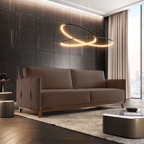 O sofá de Dubai, feito com materiais excepcionais, é a combinação perfeita de beleza, conforto e sofisticação. Sua estrutura é robusta, construída com madeira de alta qualidade, que garante durabilidade e estabilidade. O estofado, revestido em tecido macio e luxuoso, oferece um toque agradável ao toque, permitindo relaxamento total. O design é moderno e elegante, com linhas clean e minimalistas, criando um visual contemporâneo que se adapta perfeitamente a ambientes sofisticados. Produto Montado: Sim Acompanha Almofadas extras: Não Almofada do assento: Fixa Almofada do encosto: Fixa Altura do assento até o chão: 45.0000 Altura do Encosto: 40 cm Altura dos Pés: 13 cm Altura Máxima dos Pés: 13.0000 Ambiente Principal: Sala de Estar codigo_ean: 7900288025920 Complexidade da Montagem: Baixa: pode ser montado por uma pessoa sozinha Cor: Marrom Cor do Produto: Marrom Densidade do Assento: D-28 Enchimento do Assento: Espuma Enchimento do Encosto: Fibra Siliconada Itens Inclusos: 1 Sofá + 1 kit pés Marca: Encantare Material dos Pés: Madeira Necessita Montagem: Sim Peso: 70 kg Pet Friendly: Não Possui Percintas Elásticas: Sim Possui Pés: 05 Possui Rodízio: Não Recomendações de Uso, Manutenção e Limpeza: Limpeza com pano seco Sistema de Montagem: Parafusos Suporta Até (kg): 100 kg Tipo de Encosto: Fixo Tipo de Mola: Molas Bonnel Tipo de Sofá: Sofá Comum Marca: Encantare