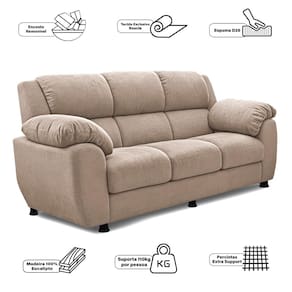 O encosto deste sofá é composto por almofadas fixas de espuma D16, garantindo suporte adequado e uma sensação de conforto ao relaxar. O assento, também fixo, é confeccionado com espuma D26 e lâminas de espuma (cascão), proporcionando uma base resistente e confortável para acomodar por longos períodos, sem perder a qualidade.