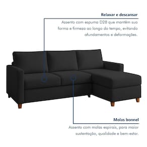 O sofá é confortável para uso diário? Sim, ele foi projetado para conforto diário. Produto Montado: Sim Acompanha Almofadas extras: Não Almofada do assento: Fixa Almofada do encosto: Removível Altura do assento até o chão: 53.0000 Altura do Encosto: 55 cm Ambiente Principal: Sala de Estar codigo_ean: 7900288250124 Complexidade da Montagem: Baixa: pode ser montado por uma pessoa sozinha Cor: Preto Cor do Produto: Preto Estilo de Braço: Braços Quadrados Itens Inclusos: 1 Sofá Linha ou Coleção: Moov Marca: Yescasa Material dos Pés: Madeira Necessita Montagem: Sim Origem do Produto: Nacional Pet Friendly: Não Possui Percintas Elásticas: Sim Possui Pés: 08 Possui Rodízio: Não Recomendações de Uso, Manutenção e Limpeza: Não utilizar produtos químicos. Não utilizar produtos abrasivos. Não molhar. Utilizar pano macio e seco ou levemente umedecido. Sistema de Montagem: Encaixe Suporta Até (kg): 120 kg Tecido Predominante: Linho Tipo de Encosto: Fixo Tipo de Mola: Não Possui Tipo de Sofá: Sofá de Canto