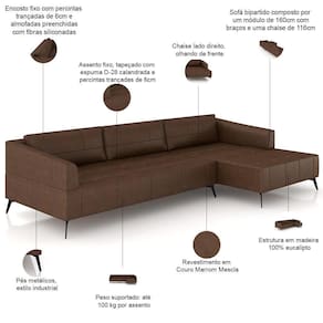 Sofá bipartido composto por um módulo de 160cm com braços e uma chaise de 116cm.