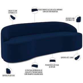 Sofá 3 Lugares Curvo Sala de Estar Living Lótus D02 Veludo Azul Marinho 210 cm C-304 - Lyam Decor