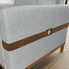 DIFERENCIAL: Braço com cinta em couríssimo e fivela de madeira, pés em madeira natural na cor mel