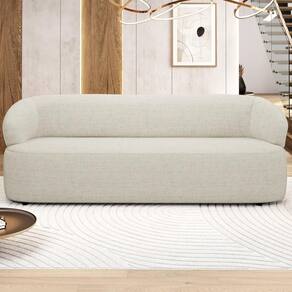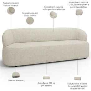 Características: Estrutura fabricada com madeira de eucalipto tratado e chapas em MDF. Revestimento em Linho na cor Mescla. Percintas elásticas no encosto e assento. Espumas do assento D-26 e com molas espirais. Encosto composto por espuma soft. Acabamento com costura rebatida, garantindo maior resistência a abertura de costuras. Pés em Madeira. Suporta até 100 kg por assento.