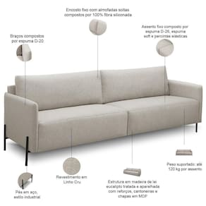 Sofá 3 Lugares Para Sala De Estar Living 204cm Industrial Italy F04 Linho Cru - Lyam Decor