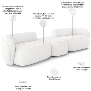 Sofá bipartido composto por dois módulos de 80cm com braços e um puff de 90cm.