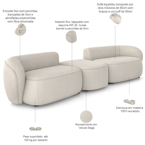 Sofá bipartido composto por dois módulos de 80cm com braços e um puff de 90cm.