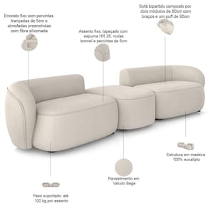 Sofá bipartido composto por dois módulos de 80cm com braços e um puff de 90cm.