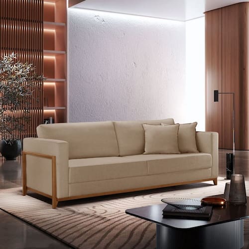 Além disso, o sofá acompanha almofadas decorativas que complementam o visual e proporcionam ainda mais conforto. As linhas retas e o estofado macio garantem uma experiência agradável ao se sentar, tornando-o perfeito para momentos de descanso ou confraternizações. Produto Montado: Sim Acompanha Almofadas extras: 02 Almofada do assento: Fixa Almofada do encosto: Fixa Altura do assento até o chão: 44.0000 Altura do Encosto: 50 cm Ambiente Principal: Sala de Estar codigo_ean: 7900288020239 Complexidade da Montagem: Baixa: pode ser montado por uma pessoa sozinha Cor: Bege Cor do Produto: Bege Densidade do Assento: D-28 Enchimento do Assento: Espuma Firmeza do Assento: Médio Itens Inclusos: 1 Sofá + 1 kit pés Marca: Encantare Material dos Pés: Madeira Necessita Montagem: Sim Peso: 70 kg Pet Friendly: Não Possui Mola: Sim Possui Percintas Elásticas: Sim Possui Pés: 05 Possui Rodízio: Não Recomendações de Uso, Manutenção e Limpeza: Limpeza com pano seco Sistema de Montagem: Parafusos Suporta Até (kg): 100 kg Tecido Predominante: Linho Tipo de Encosto: Fixo Tipo de Mola: Molas Bonnel Tipo de Sofá: Sofá Comum Marca: Encantare