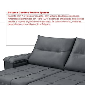 Seu encosto reclinável em cinco posições, proporcionando-lhe mais conforto na hora do descanso. Não para por aí: seu assento retrátil conta com espuma D26 com pillow top, transformando seu sofá em uma verdadeira cama para assistir seus esporte/series/filmes favoritos.