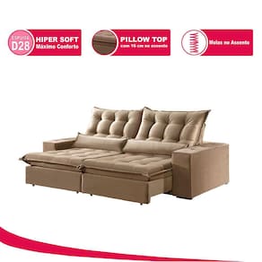 Pés: Madeira na cor marrom. Tecido: Veludo Cor do Tecido: Palha. Embalagem: Papel Ondulado, Plástico e Malha. Acompanha: Almofada Rineira, Fibra Siliconizada. Os módulos são enviados separadamente, facilitando o transporte até o local desejado.