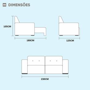 Dimensões do Produto: Altura aproximada: 105cm. Largura aproximada: 230 cm. Abertura aproximada: 180cm. Módulos: 90cm. Comprimento: 230cm. Braços: 25cm.