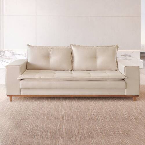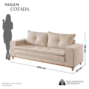 Este sofá combina tecnologia, conforto e acabamento de alto padrão. As almofadas dos encostos são preenchidas com fibra siliconada com tecnologia HCS, que proporciona maior maciez, volume e retorno ao toque. O assento conta com molas em zig zag e espuma contínua D28 de 8 cm, garantindo firmeza e durabilidade. A base frontal e os pés são produzidos em madeira imbuia mel, realçando a elegância da peça. Os braços largos, com 25 cm e espuma D28, oferecem apoio confortável. Toda a estrutura é feita em madeira de eucalipto reflorestado, unindo resistência e sustentabilidade. Acompanha Almofadas extras: Não Almofada do assento: Fixa Almofada do encosto: Removível Altura do assento até o chão: 46 cm Altura do Encosto: 46 cm Ambiente Principal: Sala de Estar codigo_ean: 7900288139078 Complexidade da Montagem: Baixa: pode ser montado por uma pessoa sozinha Cor: Bege Cor do Produto: Bege Itens Inclusos: 1 Sofá Marca: Lufer Estofados Material dos Pés: Madeira Maciça Necessita Montagem: Sim Origem do Produto: Nacional Peso: 49 kg Pet Friendly: Não Possui Percintas Elásticas: Não Possui Pés: 05 Possui Rodízio: Não Recomendações de Uso, Manutenção e Limpeza: Limpeza com pano macio e levemente umedecido. Não utilizar solventes a base e de inflamáveis. Não utilizar produtos abrasivos. Sistema de Montagem: Encaixe Suporta Até (kg): 120 kg Tecido Predominante: Linho Tipo de Encosto: Fixo Tipo de Sofá: Sofá Comum