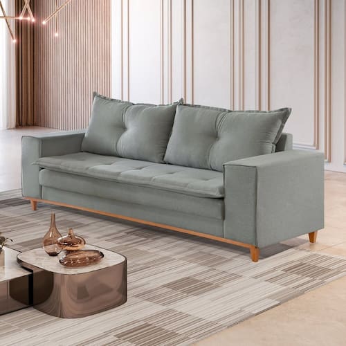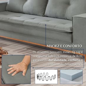 Este sofá combina tecnologia, conforto e acabamento de alto padrão. As almofadas dos encostos são preenchidas com fibra siliconada com tecnologia HCS, que proporciona maior maciez, volume e retorno ao toque. O assento conta com molas em zig zag e espuma contínua D28 de 8 cm, garantindo firmeza e durabilidade. A base frontal e os pés são produzidos em madeira imbuia mel, realçando a elegância da peça. Os braços largos, com 25 cm e espuma D28, oferecem apoio confortável. Toda a estrutura é feita em madeira de eucalipto reflorestado, unindo resistência e sustentabilidade. Acompanha Almofadas extras: Não Almofada do assento: Fixa Almofada do encosto: Removível Altura do assento até o chão: 46 cm Altura do Encosto: 46 cm Ambiente Principal: Sala de Estar codigo_ean: 7900288139054 Complexidade da Montagem: Baixa: pode ser montado por uma pessoa sozinha Cor: Cinza Cor do Produto: Cinza Itens Inclusos: 1 Sofá Marca: Lufer Estofados Material dos Pés: Madeira Maciça Necessita Montagem: Sim Origem do Produto: Nacional Peso: 49 kg Pet Friendly: Não Possui Percintas Elásticas: Não Possui Pés: 05 Possui Rodízio: Não Recomendações de Uso, Manutenção e Limpeza: Limpeza com pano macio e levemente umedecido. Não utilizar solventes a base e de inflamáveis. Não utilizar produtos abrasivos. Sistema de Montagem: Encaixe Suporta Até (kg): 120 kg Tecido Predominante: Linho Tipo de Encosto: Fixo Tipo de Sofá: Sofá Comum