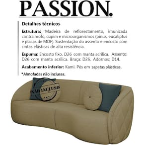 Sofa 4 Lugares 318 cm Passion Linho, é a escolha certa para você que busca conforto e bem-estar, tornando o ambiente em que estiver muito mais elegante e moderno. Estrutura em madeira de reflorestamento (pinus, eucaliptos e placas de MDF) e cintas elásticas de alta resistência. Composto por madeira imunizada contra mofo, cupim e microrganismos, revestimento em tecido linho, encosto fixo em espuma D-26 com manta acrílica, assento em espuma D-26 com manta acrílica, braça em espuma D-26, adornos em espuma D-14, acabamento inferior em kami, acompanha sapatas plásticas. Suportando até 130 kg por assento. Possui design diferenciado, que oferece sofisticação, versatilidade e charme ao seu ambiente. Este móvel chegará na sua casa separado em 02 volumes.