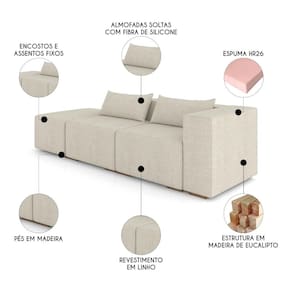 Características do Produto Material da Estrutura: Madeira de eucalipto. Material da Espuma: Espuma HR26. Peso Suportado: 120 Kg por Assento. Revestimento: Linho. Tipo de Encosto: Fixo. Tipo de Assento: Fixo. Quantidade de Assentos: 2 Assentos. Sugestão de Lugares: 4 Lugares. Possui Pés: Sim. Material Dos Pés: Madeira. Altura Dos Pés: 3 cm. Diferenciais: - Design moderno. - Revestimento linho. - Almofadas soltas com fibra de silicone. - Estrutura madeira eucalipto. Sistema de Montagem: O produto é enviado montado, necessário somente parafusar os pés e encaixar os módulos. Conteúdo da Embalagem: 1 Sofá. Volumes: 3 Volumes. Garantia do Fabricante: 90 dias contra defeito de fabricação. Montagem: Recomendamos que seja feita por um profissional. Recomendação de Limpeza: Utilize pano levemente úmido.