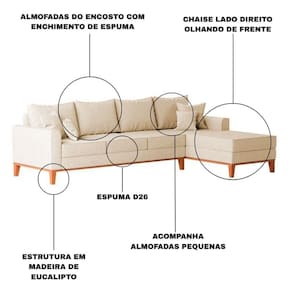 Montagem: O produto vai montado, apenas rosquear os pés e encaixar a Chaise no Sofá na peça lateral.
