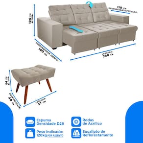 Sofá 4 Lugares Itália Plus 2,60 Metros, Retrátil Reclinável com 2 Puffs pés Palito.Sabe aquela sensação de felicidade e satisfação que você sente quando faz uma boa escolha?! Pois bem, essa é a sensação de comprar um sofá Itália Plus que possui um design moderno,acompanha 2 pufes elegantes que complementa o seu ambiente deixando ainda mais lindo e aconchegante.Ele possui encosto reclinável em cinco posições, proporcionando-lhe mais conforto na hora do descanso. E não para por aí: seu assento retrátil conta com espuma D28, transformando seu sofá em uma verdadeira cama para assistir seu filme preferido.Itens Inclusos1 Sofá;2 Pufes.Quantidade de Lugares: 4Características:- Encosto Reclinável com 5 posições, almofadas fixas compostas de 100% fibra para maior conforto.- Assentos retráteis com percintas pneumáticas com feltro para proteger do atrito.- Braços com 25cm de largura e com espuma D28 e costuras duplas.- Fixação: Grampos galvanizados antiferrugem.- Estrutura de Madeira maciça 100% eucalipto de reflorestamento, produto ecologicamente correto.FABRICANTE: WS ESTOFADOSMedidas do sofá:Altura: 100cmProfundidade fechado: 110cmProfundidade aberto: 160cmLargura: 260cmPé de tabaco:0,5 cmRodas de silicone*Suporte até 120kg por assento*Módulos: 2* Montagem Simples;*3 Meses de garantia.Informações importantes:– Os objetos que ambientam as fotos não acompanham o produto.– Tonalidade de cores pode sofrer variação conforme monitor visualizador.– Os tecidos podem sofrer alterações de tonalidades dependendo do lote de produção.– Verifique as dimensões do produto e certifique-se que o percurso que ele fará até o local de uso permite sua passagem.Quaisquer despesas ou danos no transporte até o local de uso ficam a cargo do cliente. “Em situação de escadaria ou Elevadores - Entregadores efetua apenas na portaria”......Tag Você também pode Buscar por – Sofá, sofá reclinável, sofá retrátil, sofá grande, sofá luxo, sofá confortável, sofá para casa, sofá 2 Lugares, Sofá 4 lugares, sofá com Pillow Top, sofá para apartamento, sofá clean, sofá designer, sofá lugares, sofá Grande, sofá para filme.
