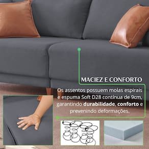 Este sofá estofado em linho exala sofisticação e conforto, complementado por um elegante detalhe em courino nos braços. Duas almofadas em linho proporcionam suavidade e aconchego, enquanto duas almofadas em courino acrescentam um toque moderno e distinto. Ideal para quem busca um mobiliário que une estilo e funcionalidade, é a escolha perfeita para qualquer ambiente. Produto Montado: Sim Acompanha Almofadas extras: 04 Almofada do assento: Fixa Almofada do encosto: Removível Altura do assento até o chão: 45.0000 Altura do Encosto: 94 cm Ambiente Principal: Sala de Estar codigo_ean: 7909903856659 Complexidade da Montagem: Baixa: pode ser montado por uma pessoa sozinha Cor: Cinza/Marrom Cor do Produto: Cinza/Marrom Itens Inclusos: 1 Sofá living. Linha ou Coleção: Canela Material dos Pés: Madeira Maciça Necessita Montagem: Sim Peso: 58,5 kg Pet Friendly: Não Possui Percintas Elásticas: Não Possui Pés: 08 Possui Rodízio: Não Recomendações de Uso, Manutenção e Limpeza: Um pano seco e um pano levemente umedecido, evitar alvejantes e produtos de limpeza. Sistema de Montagem: Encaixe. Suporta Até (kg): 120 kg Tecido Predominante: Linho Tipo de Encosto: Fixo