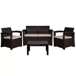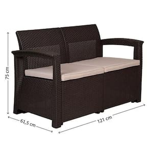 - Contéudo do Conjunto: - 1 sofá 2 lugares 121x61.5x75cm - 2 Poltronas 69*x61.5x75cm - Mesa Centro 72x52x38cm - Cor: Marrom/Bege - Fabricado em PP com Aditivo UV - Almofadas em Polyester 5cm altura, densidade 25 - Revestimento das Almofadas em Polyester 240gr/m2
