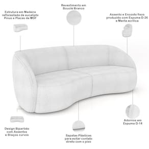 Altura: 79 cm | Color: Branco | ColorFamily: Branco | ColorSimple: Branco | ColorSupplier: Branco | Cor: Branco | Cor dos pés: Preto | Densidade da espuma do assento: D-26 | Desenho do tecido: Liso | Estilo: Orgânico | Fabricante: Lyam Decor | Formato do sofá: Curvo | Largura: 318 cm | Linha: Sala de Estar | Material: Madeira de Reflorestamento, Espuma D-26, Bouclê | Material de enchimento do encosto: Espuma D-26 | Material do estofamento: Bouclê | MaterialFamily: Madeira, Espuma | Mecanismo de abertura do produto: na | Model: Eron | Orientação do Sofá: Frontal | OriginCountry: Brasil | OriginState: PR | Peso: 65 Kg | Peso máximo suportado: 240 kg | ProductContents: 01 Sofá | ProductHeight: 79 cm | ProductInstructions: Produto para uso em ambiente interno, nao devendo ficar exposto ao sol, calor e umidade excessivos. | ProductLength: 110 cm | ProductWarranty: 90 dias após o recebimento do produto | ProductWeight: 64 kg | ProductWidth: 318 cm | Profundidade: 110 cm | Requer montagem: Não | SizeDescription: Altura: 79 cm x Largura: 318 cm x Profundidade: 110 cm | SupplierSimpleName: Sofá 4 Lugares Para Sala Living Orgânico 318cm Eron M03 Bouclê Branco - Lyam Decor | Tipo de produto: Sofá Living | Unidades por kit: 1