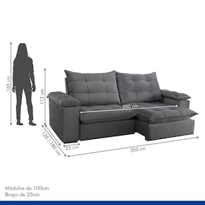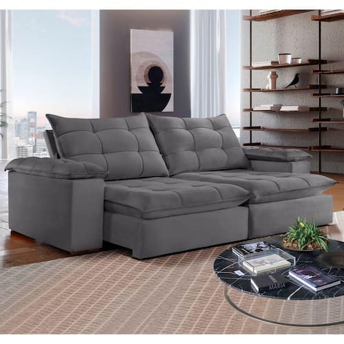 O Sofá Espanha é perfeito para a composição da sua sala de estar, pois ele permite que você passe muito mais tempo assistindo sua programação preferida de maneira confortável e aconchegante. Sua estrutura é desenvolvida em madeira de eucalipto de reflorestamento, seu encosto reclinável é 100% fibra siliconada e possui molas em seu assento retrátil com espuma D-28. Acompanha Almofadas extras: Não Almofada do assento: Fixa Almofada do encosto: Fixa Altura do assento até o chão: 50 cm Altura do Encosto: 76 cm Altura dos Pés: 2,5 cm Ambiente Principal: Sala de Estar Complexidade da Montagem: Baixa: pode ser montado por uma pessoa sozinha Cor: Cinza Cor do Produto: Cinza Densidade do Assento: D-28 Densidade do Encosto: D-28 Enchimento do Assento: Espuma Enchimento do Encosto: Fibra Siliconada Estilo de Braço: Braços Largos Firmeza do Assento: Médio Itens Inclusos: 1 Sofá Retrátil, Kit Ferragens e Manual de Montagem. Manual de Montagem e Instalação: https://cdn2.madeiramadeira.com.br/atributo/celflex/912011-sofa-espanha-e-porto-manual-de-montagem.pdf Material dos Pés: Madeira de Eucalipto Necessita Montagem: Sim Origem do Produto: Nacional Peso: 94,6 kg Pet Friendly: Não Possui Percintas Elásticas: Sim Possui Pés: 04 Possui Rodízio: Sim Profundidade Quando Estendido: 180 cm Recomendações de Uso, Manutenção e Limpeza: Não utilizar produtos químicos. Não utilizar produtos abrasivos. Não molhar. Utilizar pano macio e seco ou levemente umedecido. Revestimento do Braço: Veludo Rodízio com Trava: Não Sistema de Montagem: Parafusos e Engate Suporta Até (kg): 120 kg Tamanho: Tecido Predominante: Veludo Tipo de Encosto: Regulável Tipo de Mola: Molas Bonnel Marca: Celflex