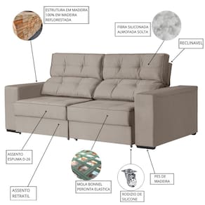 O design do EROS, com sua costura capitonê nos encostos e assentos extragrandes, garante um visual impactante e profundo conforto. Sua estrutura é retrátil e reclinável, permitindo que você personalize cada assento para um descanso ideal. É a fusão perfeita entre a estética da alta costura e a funcionalidade ergonômica. Produto Montado: Sim Acompanha Almofadas extras: Não Almofada do assento: Fixa Almofada do encosto: Removível Altura do assento até o chão: 46.0000 Altura do Encosto: 58 cm Altura dos Pés: 4 cm Altura Máxima dos Pés: 4.0000 Ambiente Principal: Sala de Estar codigo_ean: 7900288273130 Complexidade da Montagem: Média: pode ser montado por mais de uma pessoa e/ou necessite de maior conhecimento para montagem Cor: Bege Cor do Produto: Bege Estilo de Braço: Braços Quadrados Itens Inclusos: 1 Sofá e Kit Montagem Linha ou Coleção: Eros Manual de Especificação Técnica: https://product-hub-prd.madeiramadeira.com.br/656580687/documents/69bf9315-7d8d-4603-bd9e-0654e12cf2ec3290388579917612371491572.pdf Manual de Montagem e Instalação: https://product-hub-prd.madeiramadeira.com.br/656580687/documents/bc0dbbdd-8bf9-4cfe-9b3f-f70382be1bcd329038757991761237145133.pdf Marca: Konfort King Material dos Pés: Madeira Montagem Flex: não Necessita Montagem: Sim Origem do Produto: Nacional Pet Friendly: Não Possui Percintas Elásticas: Sim Possui Pés: 08 Possui Rodízio: Sim Profundidade Quando Estendido: 164 cm Recomendações de Uso, Manutenção e Limpeza: Não Utilize produtos químicos, nem aparelhos a vapor ou secador quente Revestimento do Braço: Veludo Rodízio com Trava: Não Sistema de Montagem: kit montagem Suporta Até (kg): 120 kg Tecido Predominante: Veludo Tipo de Encosto: Regulável Tipo de Mola: Molas Bonnel Tipo de Sofá: Sofá Comum Marca: Não Informado