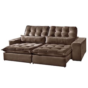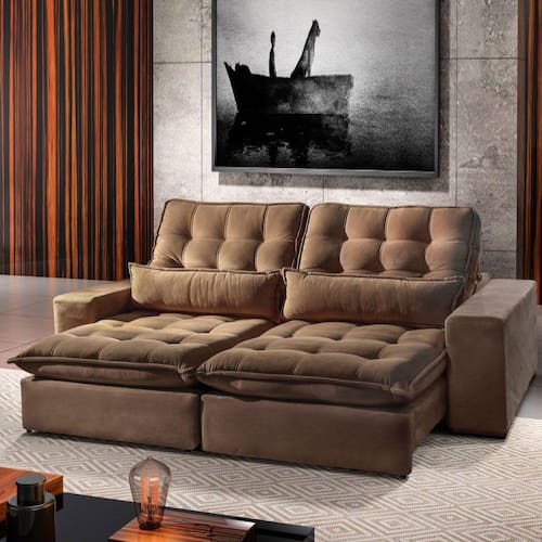 Informações Técnicas Material da Estrutura: Madeira Eucalipto Reflorestada, Seca e Imunizada. Tecido: Veludo. Cor do Tecido: Marrom Havana. Assento: Retrátil, Mola Espiral, Espuma D26 Soft, Manta Siliconada. Encosto: Reclinável em 4 posições, Fibra 100 Siliconada. Braços: Densidade D26 Soft. Embalagem: Papel Ondulado, Plástico e Malha. Presente: Almofada Rineira, Fibra Siliconizada. Capacidade em KG por Lugar: Aproximadamente 180kg. Os módulos são enviados separadamente, facilitando o transporte até o local desejado.