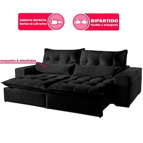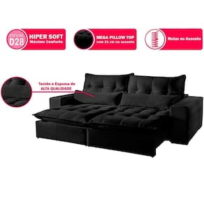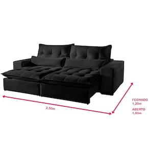 Caracteristicas: Material da Estrutura: Madeira Eucalipto , Seca e Imunizada. Tecido: Veludo. Cor: Preto Assento: Retratil, Mola Espiral, Espuma D26 Soft, Manta Siliconada. Encosto: Reclinavel em 4 posicoes, Fibra 100 Siliconada. Bracos: Densidade D26 Soft. Pes: Madeira Tabaco. Embalagem: Papel Ondulado, Plastico e Malha. : Almofada Rineira, Fibra Siliconizada. Os modulos sao enviados separadamente, facilitando o transporte ate o local desejado. Necessita Montagem: Sim. Facil montagem, nao e necessario montador. Capacidade em KG por Lugar: Aproximadamente 180kg. Limpeza: Aspirar o produto para eliminar a poeira, utilizar um pano levemente umedecido. Recomendacoes: Usar em local seco, nao molhar. Evitar exposicao ao sol, para que o produto nao sofra alteracoes na tonalidade.