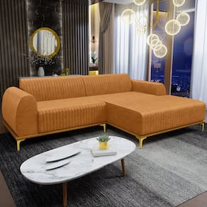O Sofá com Chaise Direito Para Sala de Estar Molino 350cm D02 da Lyam Decor, exala formosura e elegância! Excelente opção para dispor em sua sala de estar ou espera, recepção, hall de entrada, dormitório, qualquer área de circulação ou antessala entre um cômodo e outro, as possibilidades de combinação são infinitas. Seu protagonismo é notório, sem sombra de dúvidas é perfeita para qualquer ambientação que desejar colocá-la. Com sua resistente estrutura, na cor castanho com detalhes em dourado, deixarão sua decoração ainda mais sofisticada. Oferecendo máximo conforto sem deixar de transmitir todo a magnitude que seu lar merece!
