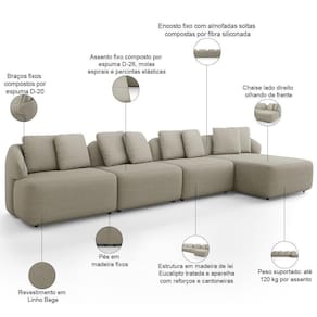 Cor: Bege | Tipo de produto: Sofá Modulado com Chaise | Fabricante: Lyam Decor | Desenho do tecido: Liso | OriginCountry: Brasil | Material: Madeira de Eucalipto, Cantoneiras, Chapas em MDF | ProductLength: 135 cm | Orientação do Sofá: Linear | ProductWeight: 185 kg | Requer montagem: Não | Unidades por kit: 1 | Material do estofamento: Linho | Linha: Sala de Estar, Living | ProductHeight: 87 cm | Peso: 185 kg | ColorFamily: Bege | Estilo: Moderno | ColorSupplier: Bege | MaterialFamily: Madeira de Eucalipto | Altura: 87 cm | Formato do sofá: Orgânico | Material de enchimento do encosto: Fibra Siliconada | Densidade da espuma do assento: D-26 | Model: Arlo | ProductContents: 01 Sofá | SupplierSimpleName: Sofá 5 Lugares com Chaise Direito Sala Living 334cm Arlo F04 Linho Bege - Lyam Decor | Color: Bege | Peso máximo suportado: 480 kg | ColorSimple: Bege | Mecanismo de abertura do produto: na | Cor dos pés: Marrom Escuro | Largura: 334 cm | ProductWarranty: 90 dias após o recebimento do produto | Quantidade de Caixas de embalagem: 4 | ProductInstructions: Produto para uso em ambiente interno, nao devendo ficar exposto ao sol, calor e umidade excessivos. | ProductWidth: 334 cm | Profundidade: 135 cm | SizeDescription: Altura: 87 cm x Largura: 334 cm x Profundidade: 135 cm | OriginState: PR