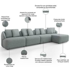 ColorFamily: Cinza | Requer montagem: Não | Desenho do tecido: Liso | Formato do sofá: Orgânico | Material: Madeira de Eucalipto, Cantoneiras, Chapas em MDF | Densidade da espuma do assento: D-26 | Orientação do Sofá: Linear | Tipo de produto: Sofá Modulado com Chaise | Material de enchimento do encosto: Fibra Siliconada | ColorSupplier: Cinza | Largura: 334 cm | MaterialFamily: Madeira de Eucalipto | ProductContents: 01 Sofá | Altura: 87 cm | Color: Cinza | Peso: 185 kg | Unidades por kit: 1 | Mecanismo de abertura do produto: na | Linha: Sala de Estar, Living | Model: Arlo | Cor dos pés: Marrom Escuro | ProductLength: 135 cm | SupplierSimpleName: Sofá 5 Lugares com Chaise Direito Sala Living 334cm Arlo F04 Linho Cinza - Lyam Decor | Cor: Cinza | Fabricante: Lyam Decor | Material do estofamento: Linho | OriginCountry: Brasil | Peso máximo suportado: 480 kg | Estilo: Moderno | ColorSimple: Cinza | ProductHeight: 87 cm | OriginState: PR | ProductWidth: 334 cm | ProductInstructions: Produto para uso em ambiente interno, nao devendo ficar exposto ao sol, calor e umidade excessivos. | ProductWarranty: 90 dias após o recebimento do produto | Quantidade de Caixas de embalagem: 4 | SizeDescription: Altura: 87 cm x Largura: 334 cm x Profundidade: 135 cm | Profundidade: 135 cm | ProductWeight: 185 kg
